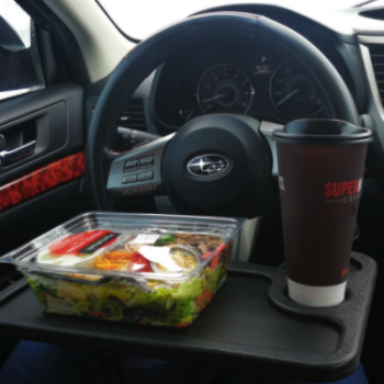 As an outside sales rep I sometimes feel like I live in my car. This dual purpose tray is a 'must have' if you need a well positioned mobile desk or a less awkward way to eat (and avoid wearing) your lunch. It's nice that both sides are functional... a food tray complete with cup holder on one side, and and a smooth flat writing surface on the other. You won't have to worry about getting grease or food residue on your paperwork! Also works well with small laptops or your iPad. Made of high-impact plastic, it won't melt or warp if you leave it sitting in your hot car... virtually indestructible. I can't imagine how I lived without one of these for so many years!