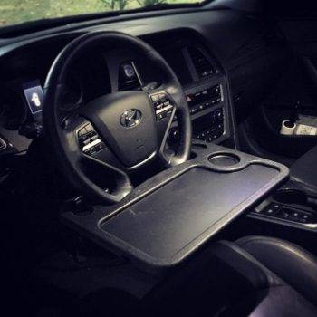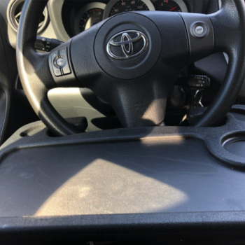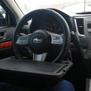 and the steering wheel doesn't have to be turned upside down. This makes the occasional eating in the car much neater. This table, I got the large one, is sturdy and does require a seat adjustment. The flip side has a nice writing surface and a place to secure a pen or pencil. Happy with my purchase. Suggest using this with the engine off if you intend to set your soda on the tray. The combination of power steering and the weight of a full drink on the tray can result in a wet lap. Lol, it hasn't happened yet but I'm just putting it out there