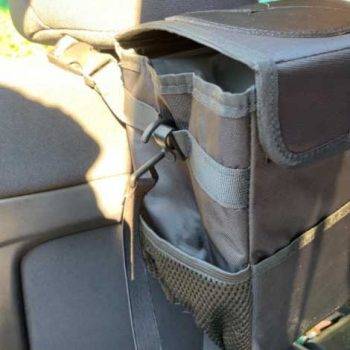 This trashcan works well in our SUV. With three kids and a busy schedule we often eat snacks or food in the car. This is the third trashcan I’ve now bought for a vehicle, and this one they got it right. The size is good and holds quite a bit. The thing I like the most is the top you don’t actually have to undo it or do anything to access the trash can you just push it in the top. My kids broke the last one by stepping on it too many times, and this one actually is elevated off the ground which makes less of a tripping hazard. You can also put a trash liner it so you can just take out the whole bag of trash out quickly and easily. It also had like a bungee cord on it if you didn’t want to use the strap if you wanted to utilize it somewhere else. I put it around my center console so it could be utilized in the backseat.